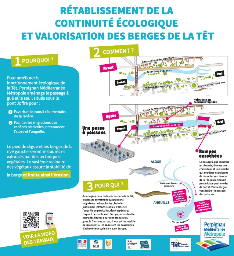PMM intervient dans le rétablissement de la continuité écologique du pont Joffre et du passage à gué des expositions. Le SMTBV, quant a lui, intervient pour la gestion du risque inondation par le confortment de la digue Vernet-Est qui surplombe la berge en rive gauche.
