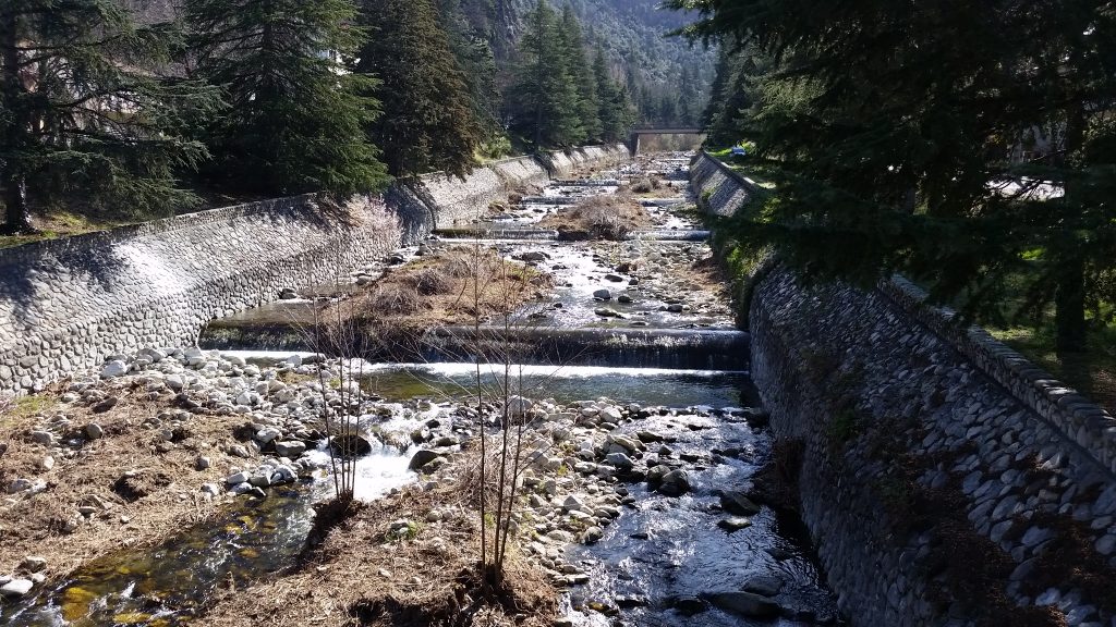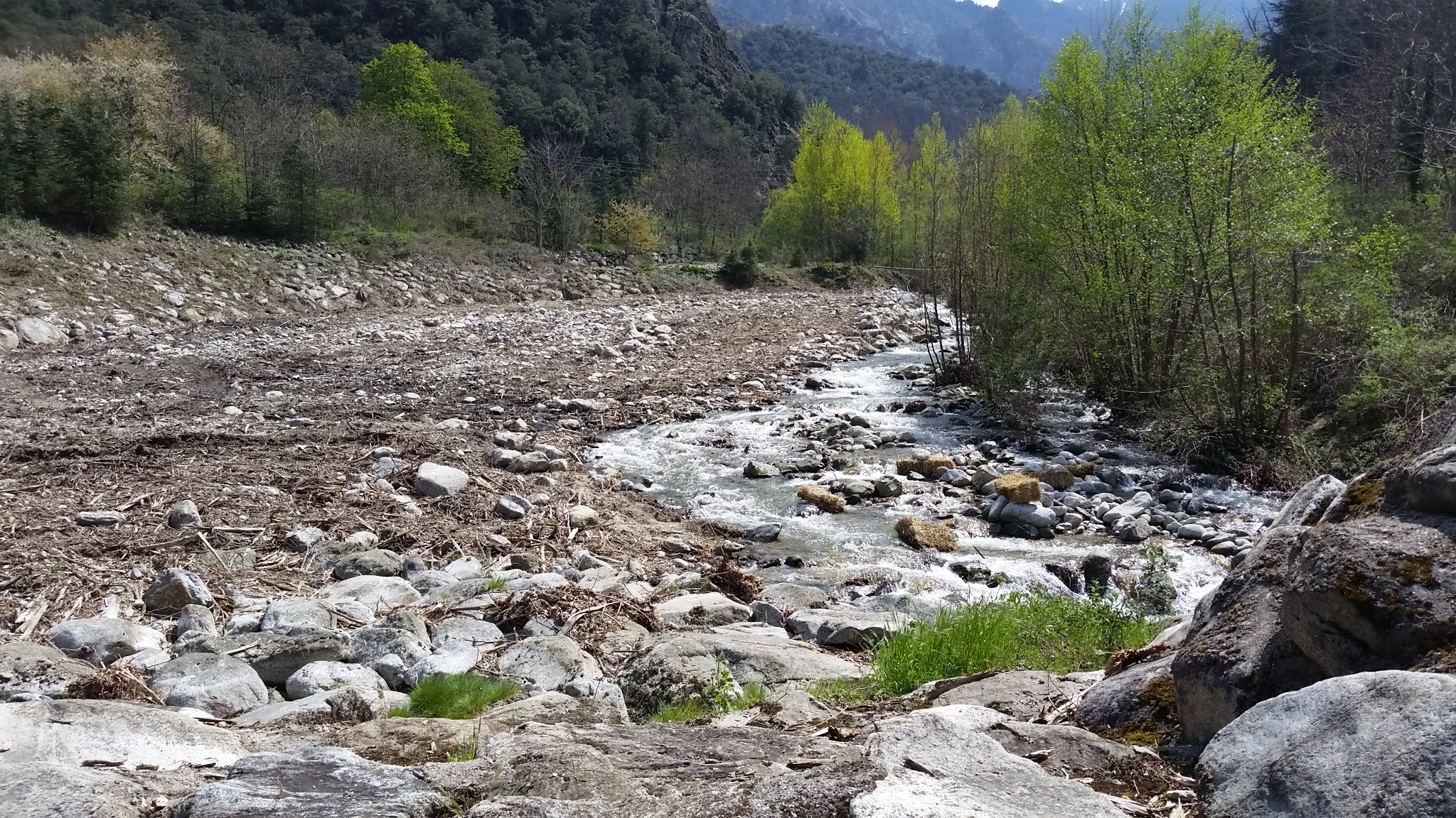 Vue du Cady dans de la traversée de Vernet-les-Bains après chantier. Quelques arbres (essences typiques des cours d’eau : aulne, frêne, etc.) ont été conservées afin de créer des zones d’ombrage dans le lit du cours d’eau qui sont propices aux frayères et destruction des espèces invasives comme le buddleia.