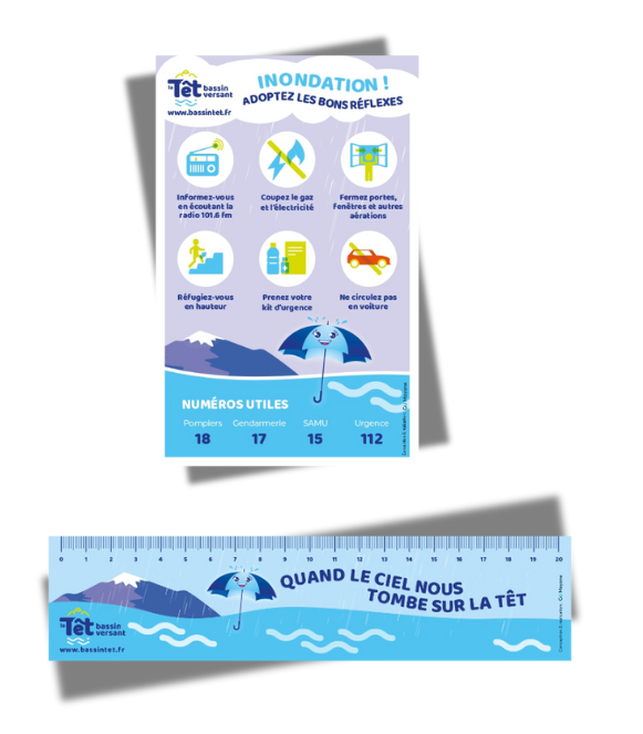 Voici nos deux nouveaux outils de sensibilisation au risque inondation ! Destinés aux adultes et aux enfants, ce magnet et cette règle informent des bons
