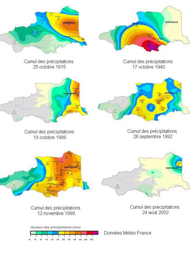 La pluviométrie a principalement affecté la plaine du Roussillon et le piémont, avec un axes de maximum sensiblement Sud Nord (Cf. planche cumul pluviométriques), les plus forts cumuls se localisant notamment à Thuir (413 mm). Avec un débit maximal d’environ 850 m3/s à Perpignan (période de retour 10 ans) cette crue est le fruit d’une contribution forte du bassin aval (avec néanmoins une contribution faible de la part du Boulès) en particulier au regard du fonctionnement en transparence du barrage de Vinça dont les lâchures sont restées comprises entre 90 et 126 m3/s. Cet évènement a provoqué des débordements de tous les cours d’eau aval rive gauche de la zone d’étude. Ainsi, de nombreux villages du secteur aval rive gauche ont été inondés. Ce fût notamment le cas de Corneilla-la-Rivière par le ravin des Coumes, de Pézilla-la-Rivière par le Clot d’en Godail et le ravin de la Berne, Villeneuve-la-Rivière par le ravin de Padrère et le Manadeil et Baho par le Manadeil. L’événement constitue donc une référence pour les affluents avals rive gauche alors que la période de retour estimée pour le débit de la Têt à Perpignan n’est que de 11 ans.
