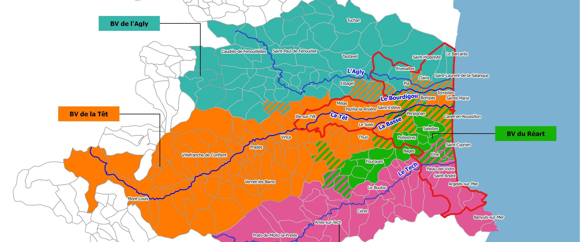 Enfin, à l'aval de Perpignan se trouve une très importante zone d'expansion de crues, favorisée par une faible pente et la présence de reliefs en rive droite (terrain naturel + RN 116). On se trouve dans les basses plaines de la Têt et de l'Agly. Pour des crues majeures l'intégralité des communes implantées dans cette plaine littorale est inondée sous des hauteurs d'eau de 1 mètre et plus. Notons par ailleurs que cette zone du Bourdigou est également exposée aux crues débordantes du bassin versant de l'Agly.